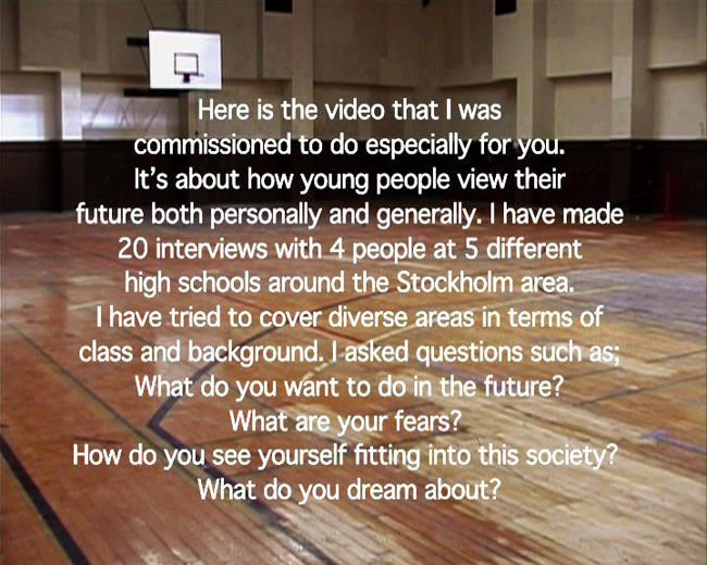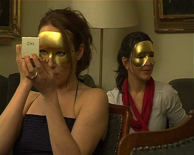 The theatrical draping of the exhibition space also resonates with the work on exhibition. Jack of all Trades by Tova Mozard is composed from individual interviews with the seven curators about their own projects, aspirations, and thoughts on the field as a whole. It was commissioned to use the reflections of the curators as its raw material to be re-worked, re-staged and edited by the artist. Mozard often works with an interview format as a narrative frame for her videos. Using a gesture that confuses the usual power positions of artist and curator, Tova Mozard has been given free hands to produce the video piece. The power over the image through selection and framing by the curator is in this case interwoven with the power that the artist has in selection and framing of the curator’s image. An interesting and unique relationship of trust, vulnerability and collaboration is established through this experimental format. The material was filmed in several sessions. Individual interviews formed the basis for a polyphonic script incorporating the individual utterances into one voice. This was followed by a re-staging, aptly held in the waiting room at the Royal Dramatic Theatre, where the curator’s role was re-enacted. The behind-the-scenes claustrophobia of the play within the play further filters and mediates the statements and ‘message’ of the masked curators.